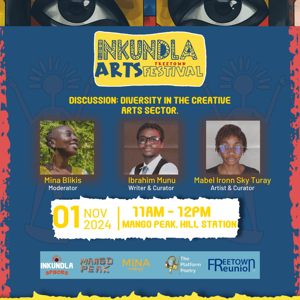 Join us for an insightful discussion exploring Diversity in the Creative Arts Sector on November 1st, 2023. This event takes place at Mango Peak from 11 AM to 12 PM. The panel, featuring Mabel Ironn Sky Turay and Ibrahim Munu, moderated by Mina Bilkis, will explore crucial topics such as creating inclusive spaces for creatives, funding, and navigating limited resources in Sierra Leone. Don’t miss out on this opportunity to engage in meaningful conversations about the future of the arts!