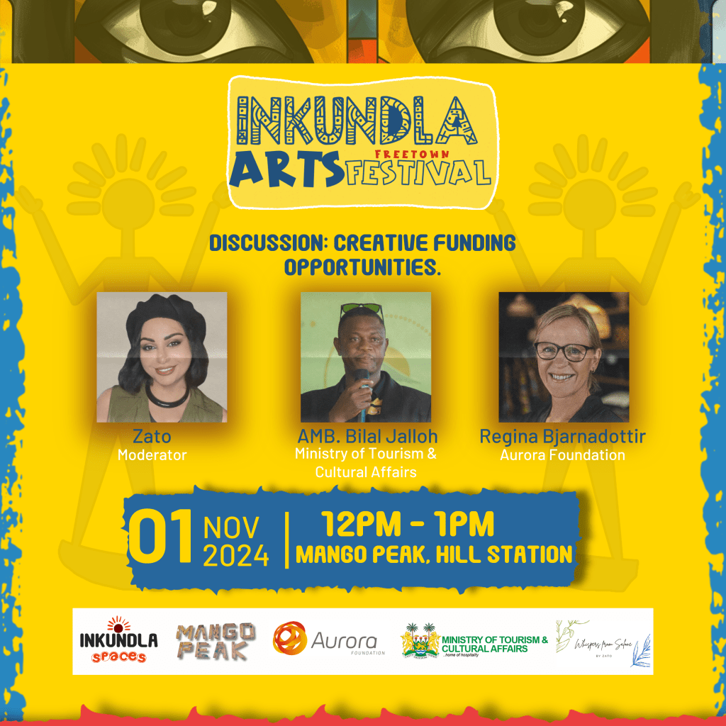 Join us for a thought-provoking discussion on How Creatives Can Package Themselves, Get Funding, and Make an Impact on November 1st, 2023 at Mango Peak from 12 PM to 1 PM. Moderated by Zato, the session will feature Bilal Jalloh from the Ministry of Tourism and Regina Bjarnadottir from Aurora Foundation. We’ll dive into topics like creative self-packaging, securing funding, and making a lasting impact in Sierra Leone’s creative scene. Don’t miss this chance to gain valuable insights into the business of creativity!