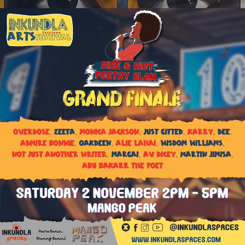 Witness the Grand Finale of Rise & Riot Poetry Slam on November 2nd, where 15 of Sierra Leone’s finest poets will go head-to-head for the title of Grand Slam Champion of 2024. Competing poets include OVERDOSE, ZEEFA, MONICA JACKSON, JUST GIFTED, KARRY, DEE, ADMIRE BONNIE, OAKDEEN, ALIE LAHAI, WISDOM WILLIAMS, NOT JUST ANOTHER WRITER, MARGAI, AV DICEY, MARTIN JIMISA, and ABU BAKARR THE POET.